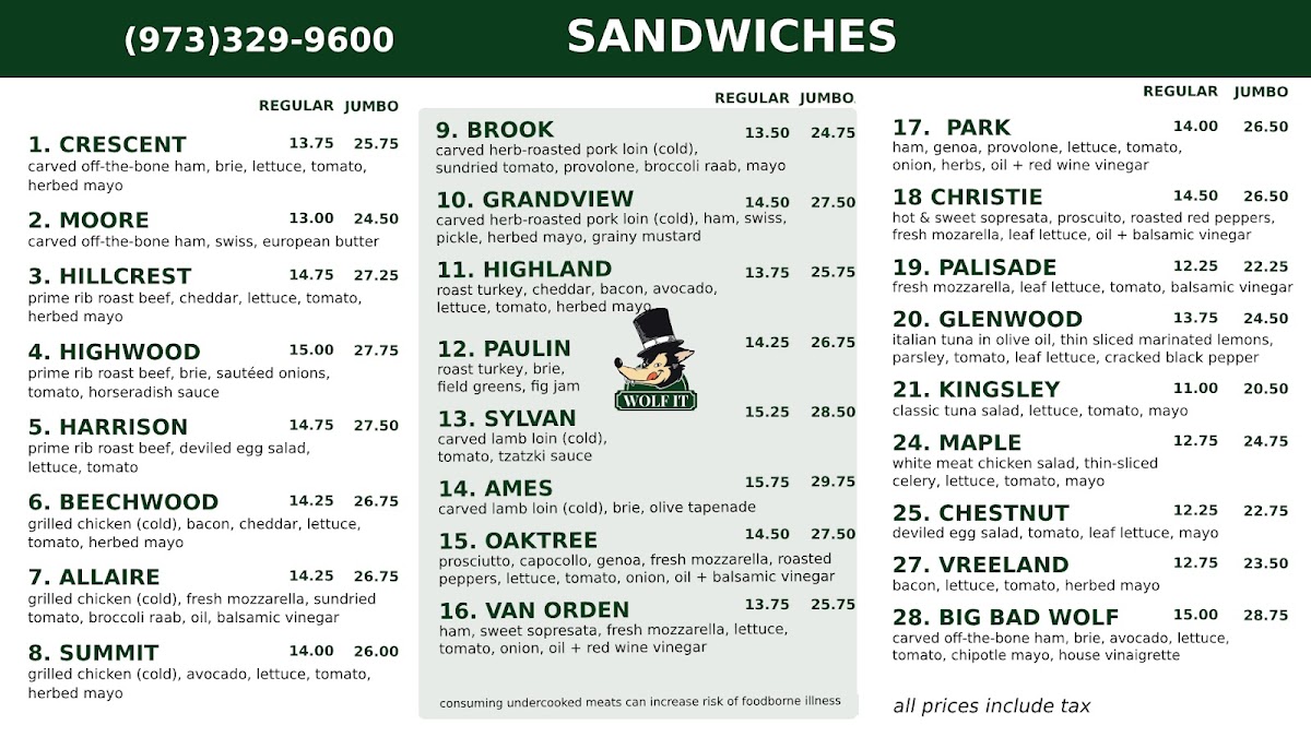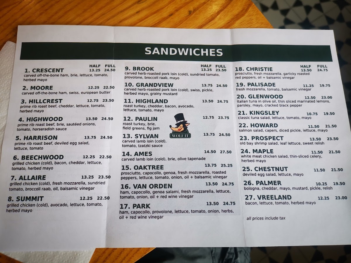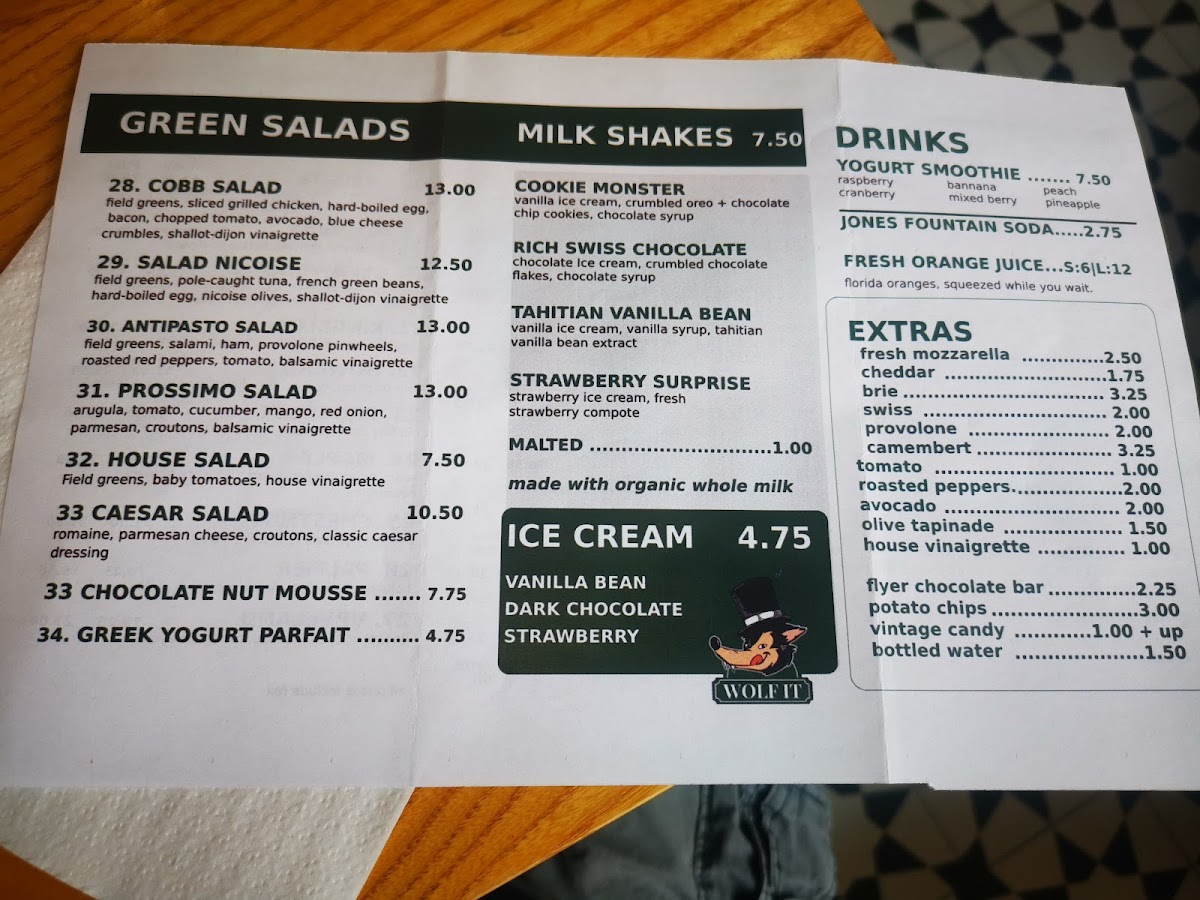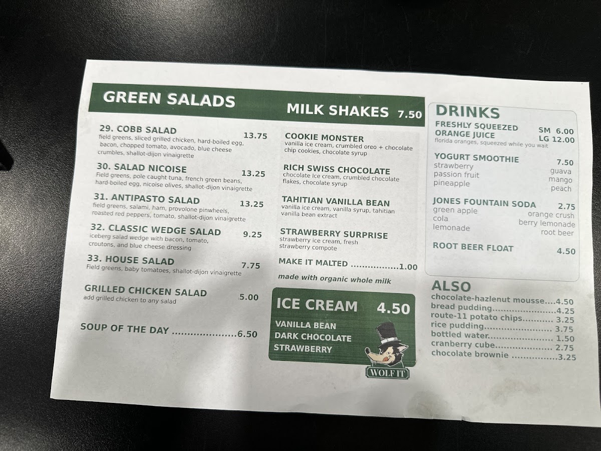 Wolf It offers a diverse and exciting menu that caters to a variety of tastes. For those looking for a fresh start, their Classic Wedge Salad ($32) and Cobb Salad ($29) are great choices, while the Salad Niscoise ($33) brings a unique twist to the table. If you prefer something lighter, the House Salad ($31) or the Antipasto Salad ($31) are satisfying options. For a sweet treat, their Tahitian Vanilla Bean Shake and Rich Swiss Chocolate Shake are classics, while the Cookie Monster Strawberry Surprise offers a fun flavor combo. For dessert, indulge in the Classic Rice Pudding, Chocolate-Hazelnut Mousse, or Deep Chocolate Brownie, which are sure to please any sweet tooth. When it comes to soups, Wolf It doesn’t disappoint with choices like Potato Leek Soup, Shrimp Corn Chowder, and Lobster Bisque, to name a few. Sandwich lovers can enjoy their selection, with favorites like the Allaire ($7) and the Kingsley ($21), along with other delicious options such as the Grandview ($20) and Glenwood ($17). To accompany your meal, there are refreshing drinks available, including Fountain Green Apple and Fountain Root Beer, both made with cane sugar only, as well as Pellegrino and Diet Coke. For those craving a crunchy side, Wolf It offers Route 11 Salt & Pepper Chips and Route 11 Salt & Vinegar Chips, adding the perfect balance to any meal. With a menu full of flavorful and satisfying choices, Wolf It provides a memorable dining experience for all.